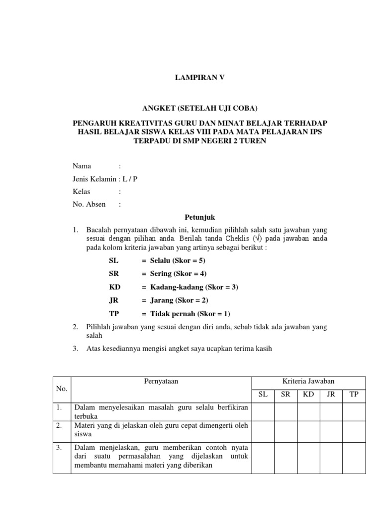 4 Contoh Angket Penelitian Kuantitatif, Pendidikan, Dan Hasil Belajar.