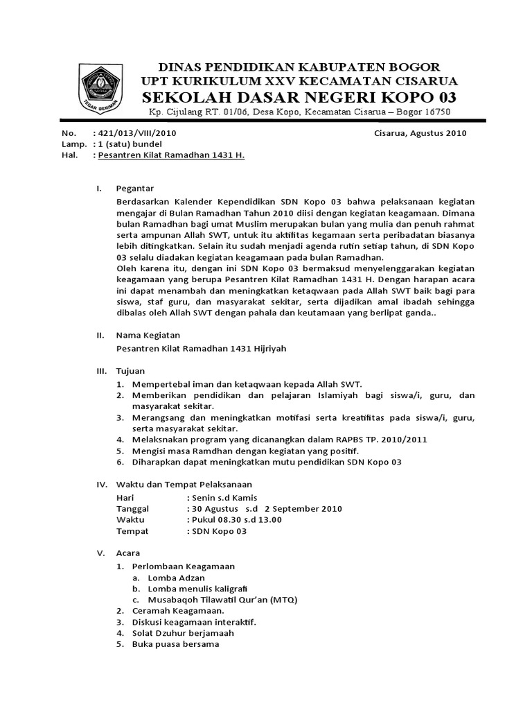 Hal ini perlu disikapi dengan bijak, mengingat teknologi yang maju tidak hanya membawa dampak positif, tetapi juga negatif. File1 contoh proposal kegiatan pesantren kilat, pesantren ramadhan / sanlat sd baca juga contoh proposal, tema, dan jadwal kegiatan pesantren kilat (sanlat) ramadhan tingkat sd ada dua file yang bisa bapak ibu guru unduh untuk level sd diatas, silahkan gunakan yang mana saja yang paling sesuai dengan karakteristik sekolah bapak ibu, atau mungkin yang paling mudah. Dalam mengisi bulan ramadhan, seperti biasanya selalu diadakan program kegiatan yang sifatnya keagamaan yang terkait dengan bulan puasa oleh guru pendidikan agama islam (pai). Sebagai salah satu agenda rutin yang diadakan setiap ramadhan, setiap sekolah biasanya mengadakan pesantren kilat (sanlat) dan memasukkannya dalam program yang wajib diikuti oleh para pelajar. Tarikh islam proposal ini sebagai pedoman palaksanaan kegiatan pesantren intensif agar terlaksana secara efektif dan efesien sesuai dengan program untuk mencapai maksud dan tujuannya. Yang akan di isi tausyiah yang akan di sampaikan oleh ust. Mengetahui, memahami dan menghayati ajaran islam meliputi baca tulis al qur'an, keimanan, ubudiyah, akhlaq, dan hukum islam. Contoh laporan kegiatan pesantren kilat ramadhan 1434 hdocx. Kegiatan ini diikuti oleh siswa/siswi madrasah untuk menambah pengetahuan agama khusus pada bulan suci ramadhan.