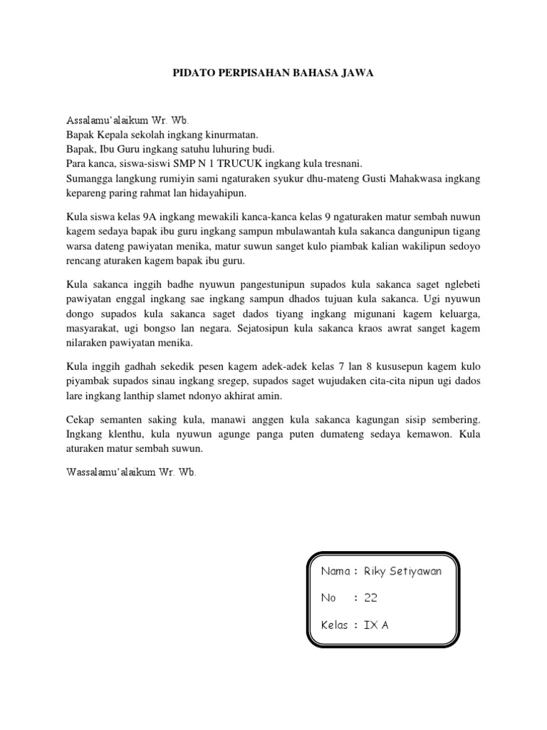 Bapak kepala sekolah sma n 1 semarang ingkang dahat kinurmatan bapak ibu guru saha karyawan ingkang kula hormati tamu undangan ingkang kula hormati uga mboten katalumpen rencang rencang sedaya ingkang kula tresnani. Pidato bahasa jawa tentang perpisahan sekolah. Perpisahan sekolah selalu dilaksanakan untuk seremoni formal perpisahan antara kelas 9 dengan sekolah, namun bukan untuk selamnya. Bapak/ibu guru ingkang kula kurmati. Jika anda sedang mencari pidato berbahasa jawa mengenai perpisahan bisa mencoba melihat referensi pidato bahasa jawa perpisahan yang kami sampaikan di bawah. Pidato bahasa jawa perpisahan kelas 9 singkat maret 20, 2021 1 komentar sesorah adalah merupakan bentuk dari pidato dengan menggunakan bahasa jawa, pidato sendiri memiliki arti berbicara menggunakan lisan di hadapan banyak orang / orang umum untuk tujuan tertentu.ada berbagai jenis pidato bahasa jawa yang biasa digunakan, berbagai macam topik. Bilih kathah klenta klentunipunn ing atur, kula nyuwun agunging samudra pangkasama. Teks pidato perpisahan kelas 9 bahasa jawa contoh pidato perpisahan kelas 9 bahasa jawa tahun ini tentunya sedang dalam semester genap pendidikan di indonesia yang mana sisawa siswi kelas 9 smp akan mempersiapkan perpisahan atau kelulusan di sekolahnya. Nah pada kesempatan ini saya akan memberikan contoh pidato perpisahan singkat untuk kelas 9.