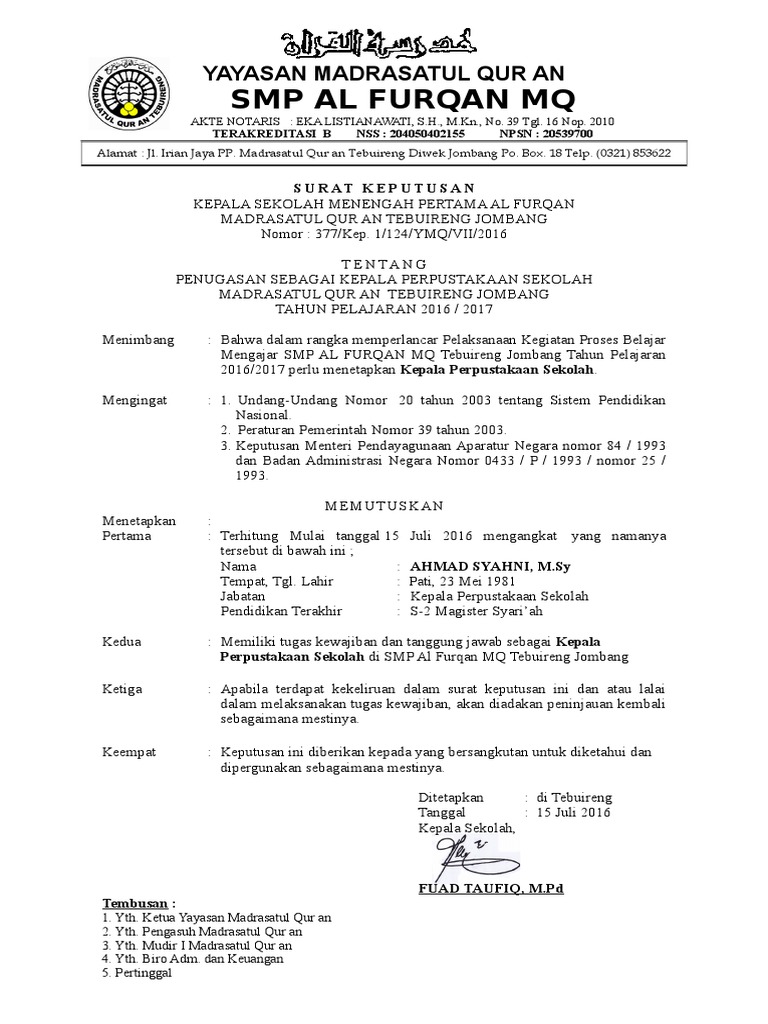 3) surat keputusan izin pendirian pts serta semua izin. Contoh program kerja perpustakaan sekolah format word berikut ini kami bagikan contoh program kerja supervisi akademik format word untuk kepala sekolah jenjang smp, mts, sma, smk dan ma yang bisa digunakan sebagai referensi dalam membuat rencana kegiatan untuk 1 tahun pelajaran. Gambar di atas adalah contoh dari struktur organisasi perpustakaan sekolah. Contoh sk pengangkatan kepala perpustakaan cara membuat surat keputusan (sk) yang mudah dan rapi cara membuat format surat keputusan, cara membuat format sk, cara membuat sk denganmudah, tutorial word indonesia, www.ontakontak.com. Contoh sk pengangkatan kepala perpustakaan. Contoh sk kepala perpustakaan terbaru / catatan seorang guru: 1 belawa maka perli menerbitkan sk kepala perpustakaan. Ya yayasan madrasa madrasatul tul qur qur an smp al furqan mq akte. Contoh sk kepala madrasah tentang tim bpopp.