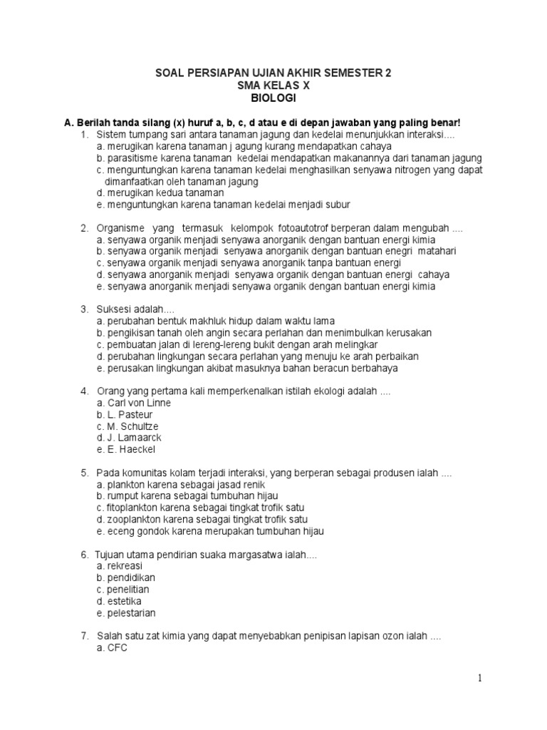 Bagi anda yang membutuhkan referensi soal ulangan kenaikan kelas / soal penilaian akhir tahun biologi kelas 10, 11, 12 semester 2, berikut kami bagikan link downloadnya. Sebutkan dan jelaskan dua jenis gangguan pencernaan pada lambung! 1) menjaga keseimbangan fungsi tubuh. Kelompok sel yang mempunyai ukuran dan bentuk yang berbeda. Pada materi kali ini, tidak hanya dilengkapi dengan soal biologi dan jawabannya, akan tetapi juga dilengkapi dengan jawaban, pembahasan serta kisi kisi ujian biologi sma/ma tentang ekosistem. 1 soal biologi sma/ma uas, usbn, tryout sbmptn semester i dan ii kelas x, xi dan xii tentang kingdom plantae. Soal uas biologi sma kelas 11 semester 2 tahun 2013. Sebelumnya kami telah mempublish 25 contoh soal (20 pg+ 5 essay/uraian), yang bisa siswa menengah atas baca dan pelajari sebagai referensi belajar online, yaitu:. Latihan soal biologi sma kelas xi ipa semester 2.