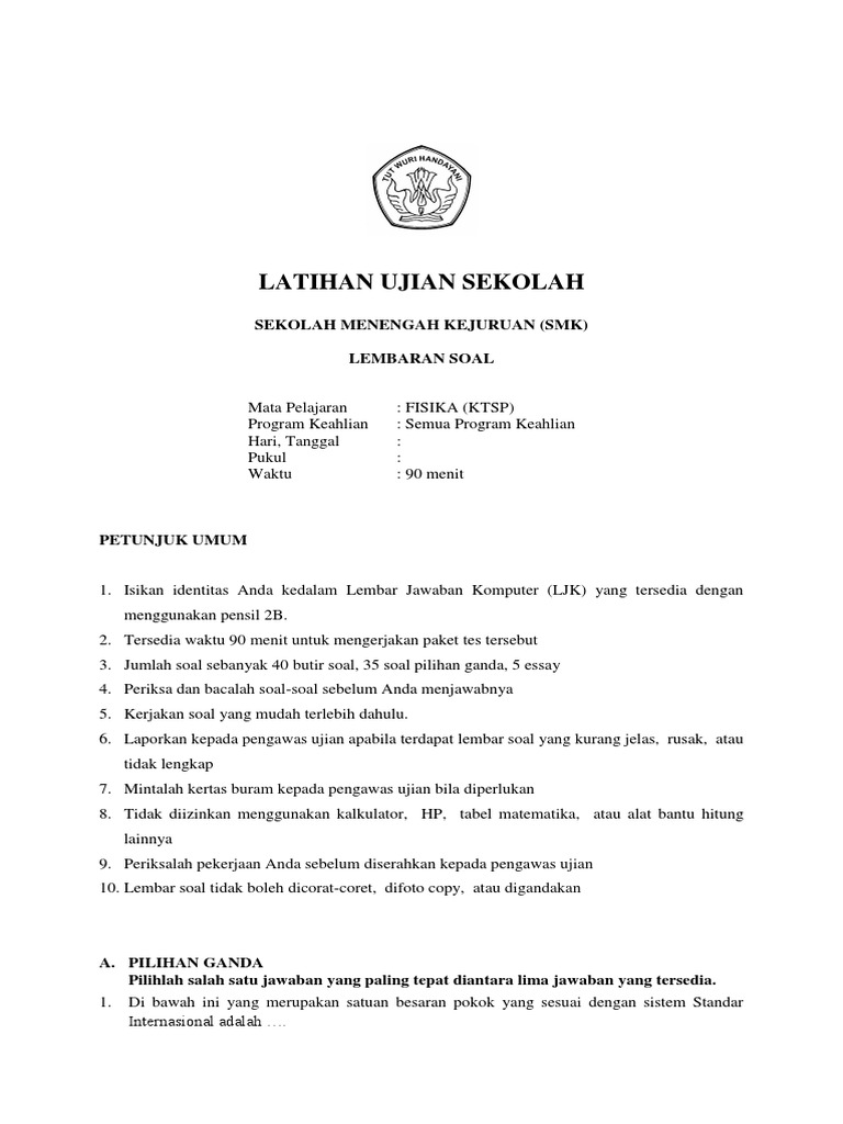 Hai sobat soal prediksi, kembali lagi dengan admin pada pemberian latihan soal usbn di jenjang smk. Pembahasan soal kelas xii fisika. Sebagai bahan latihan berikut ini kami sajikan naskah asli soal usbnn sma (fisika) tahun 2019 yang lalu, dan juga bisa langsung di download via google drive. Jangan lupa terus belajar dengan optimis, karena fisika itu asik dan mudah! Pembahasan soal usbn jabar 2018 paket 1 ; Diantaranya adalah bahasa indonesia, bahasa inggris, matematika, fisika, simulasi digital, sistem komputer, dan. Soal usbn fisika smk 2019. Latihan soal dan kunci jawaban usbn fisika smk 2022. Usbn (ujian sekolah berstandar nasional) tinggal menghitung bulan, dan tidak terasa pasti akan berlalu.