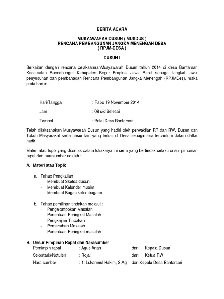 Yang selanjutnya akan diserahkan kepada bpd untuk dibahas dalam musyawarah bpd. Format contoh surat berita acara hasil musyawarah yang baik 2019. Pembahasan rancangan apbdesa juli tambo tanjong tahun anggaran 2020; Sahabat dapat mendowload dalam bentuk dokumen ms word atau pdf melalui link berikut: Akhir kata, demikian pembahasan mengenai contoh berita acara (ba) musyawarah desa penetapan data sdgs desa 2021, semoga bermanfaat dan salam merdesa. 2014 (227) desember (4) november (39) agustus (36) april (110) januari (38) Berita acara badan permusyawaratan desa (bpd) adalah hasil pembahasan, tindaklanjut dan kesepakatan atas pelaksanaan musyawarah badan permusyawaratan desa baik yang dilaksanakan secara internal maupun yang dihadiri oleh kepala desa. Salah satu prosedur penggantian anggota bpk kampung atau desa yang mengundurkan diri adalah dengan mengadakan musyawarah tingkat bpk, dusun, dan kampung yang dituangkan dalam bentuk surat usulan pemberhentian dan pengangkatan anggota baru pengganti bpk dan. Muhlisan wakiden dari ketua bpd persatuan sekretaris/notulen narasumber.