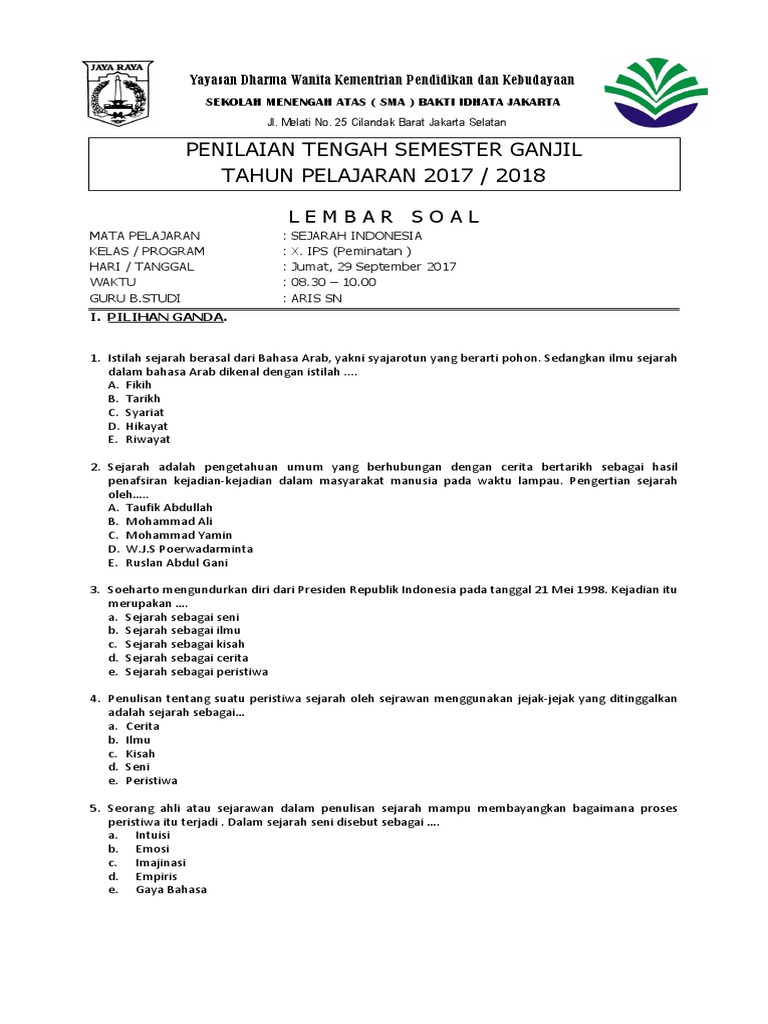 Latihan Soal Uts Sejarah Peminatan Kelas 10 Semester 2.